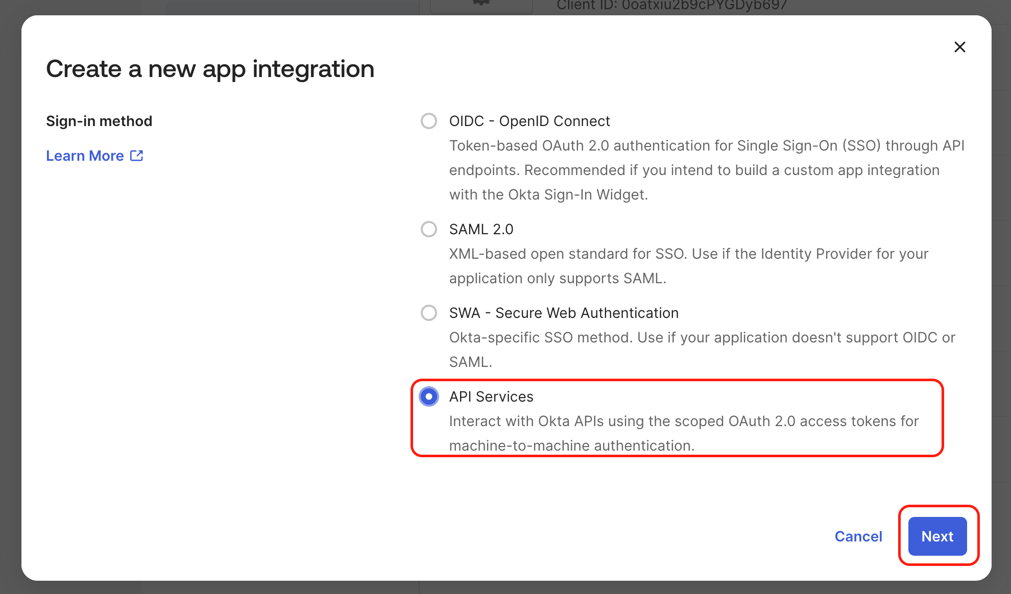 In your Okta org, create a new API Services App Integration.
