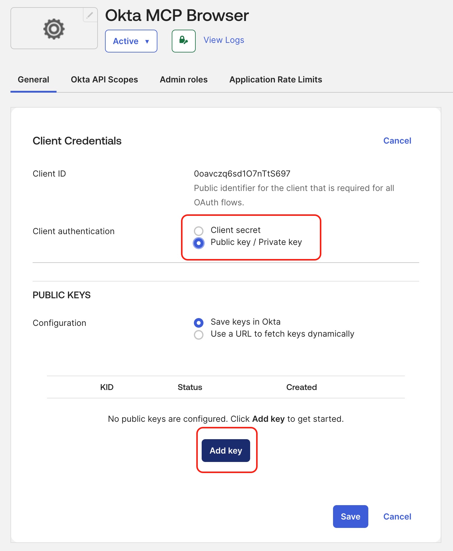 Add a public key: either generate it in Okta (recommended) and copy it in PEM format, or upload your own keys.