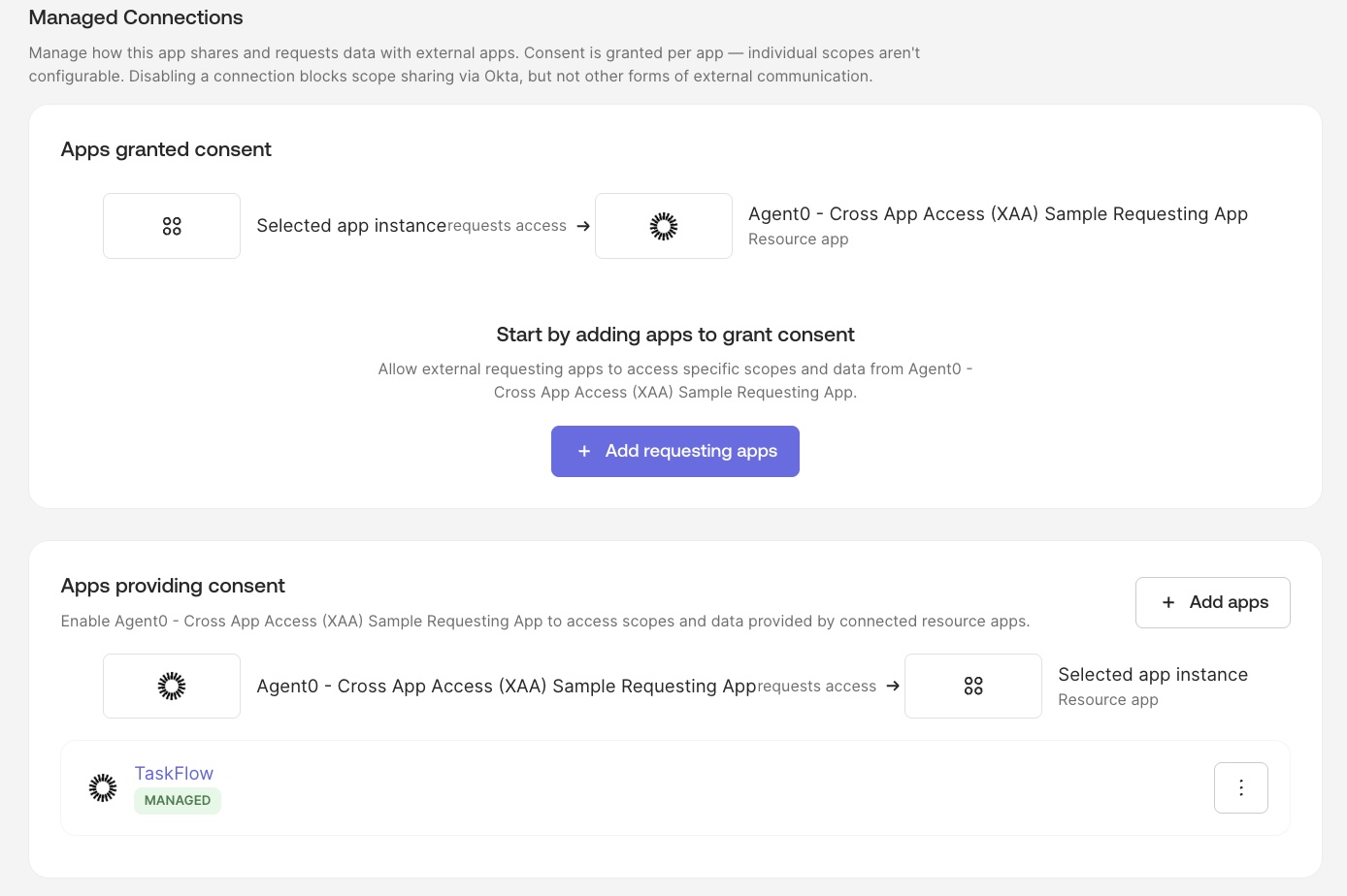 - Register the requesting app (Agent0) in your org as a known XAA app and connect it to TaskFlow.