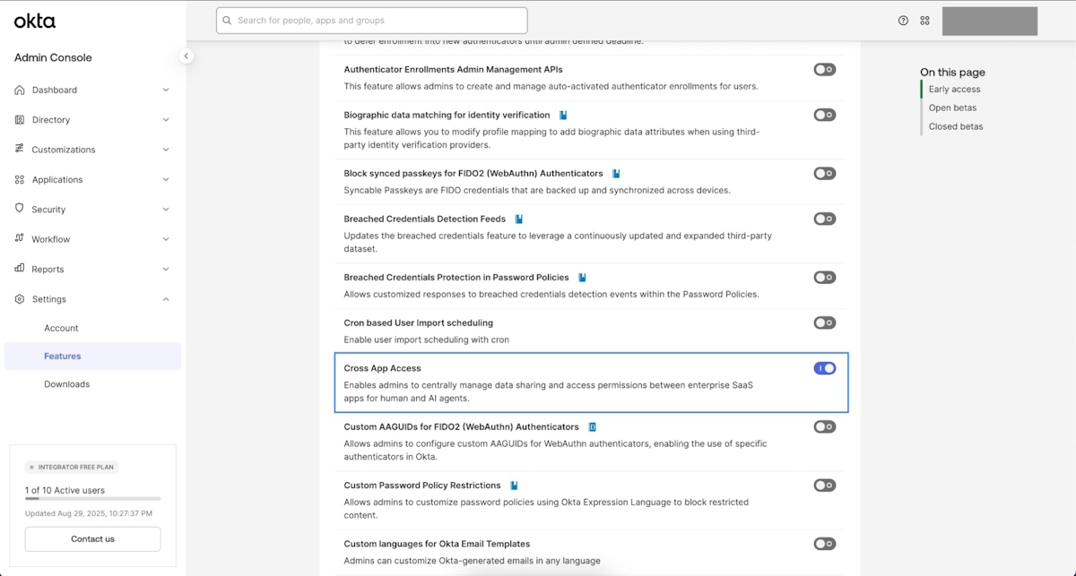 Note: Cross App Access is currently a self-service Early Access (EA) feature. You must enable it through the Admin Console before the apps appear in the catalog. If you don’t see the option right away, refresh and confirm you have the necessary admin permissions. Learn more in the Okta documentation on managing EA and beta features.